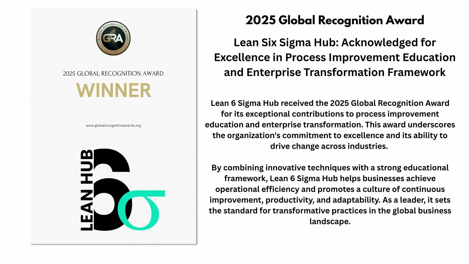 Lean 6 Sigma Hub has been awarded a 2025 Global Recognition Award for its outstanding contribution to Lean Six Sigma training, enterprise transformation, and educational innovation. This global honor affirms our mission to make continuous improvement practical, scalable, and impactful for professionals and organizations worldwide..