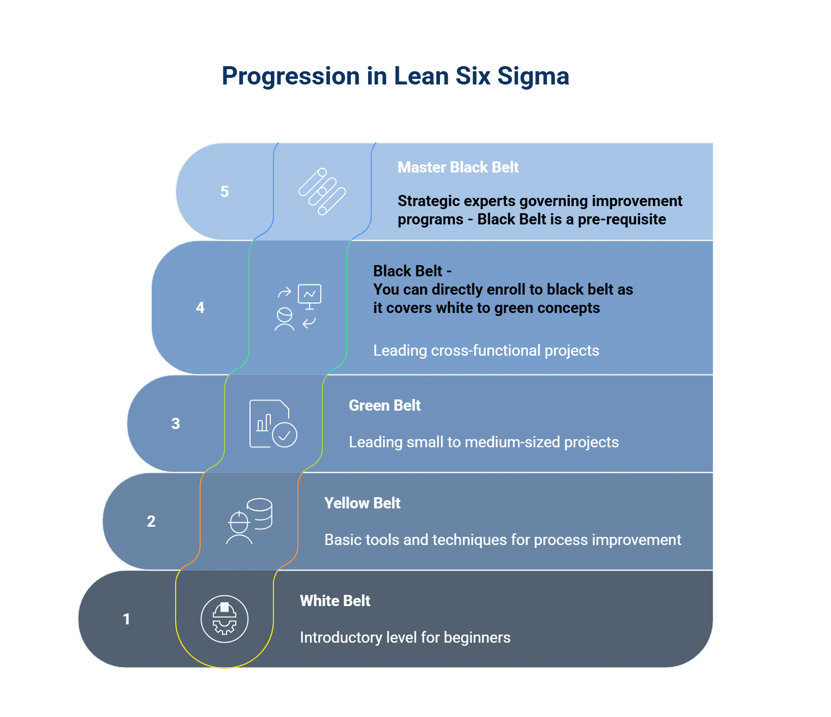 Learn how each belt level builds your skills in problem solving, data analysis and process improvement. All courses are self paced and designed for online study.