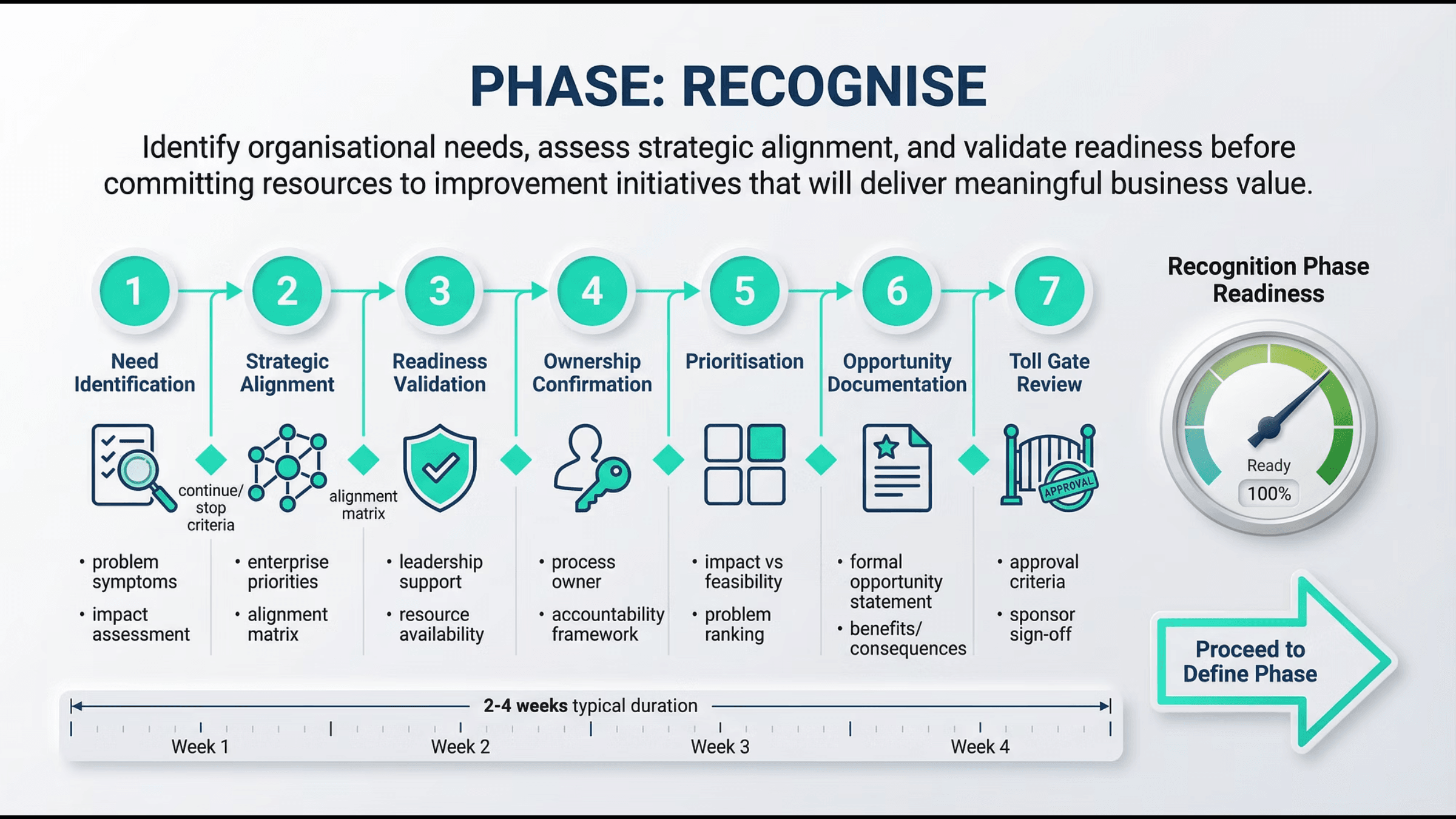 Identify organisational needs and assess strategic alignment before committing resources. Validate readiness, confirm sponsorship, establish process ownership, and prioritise improvement opportunities.