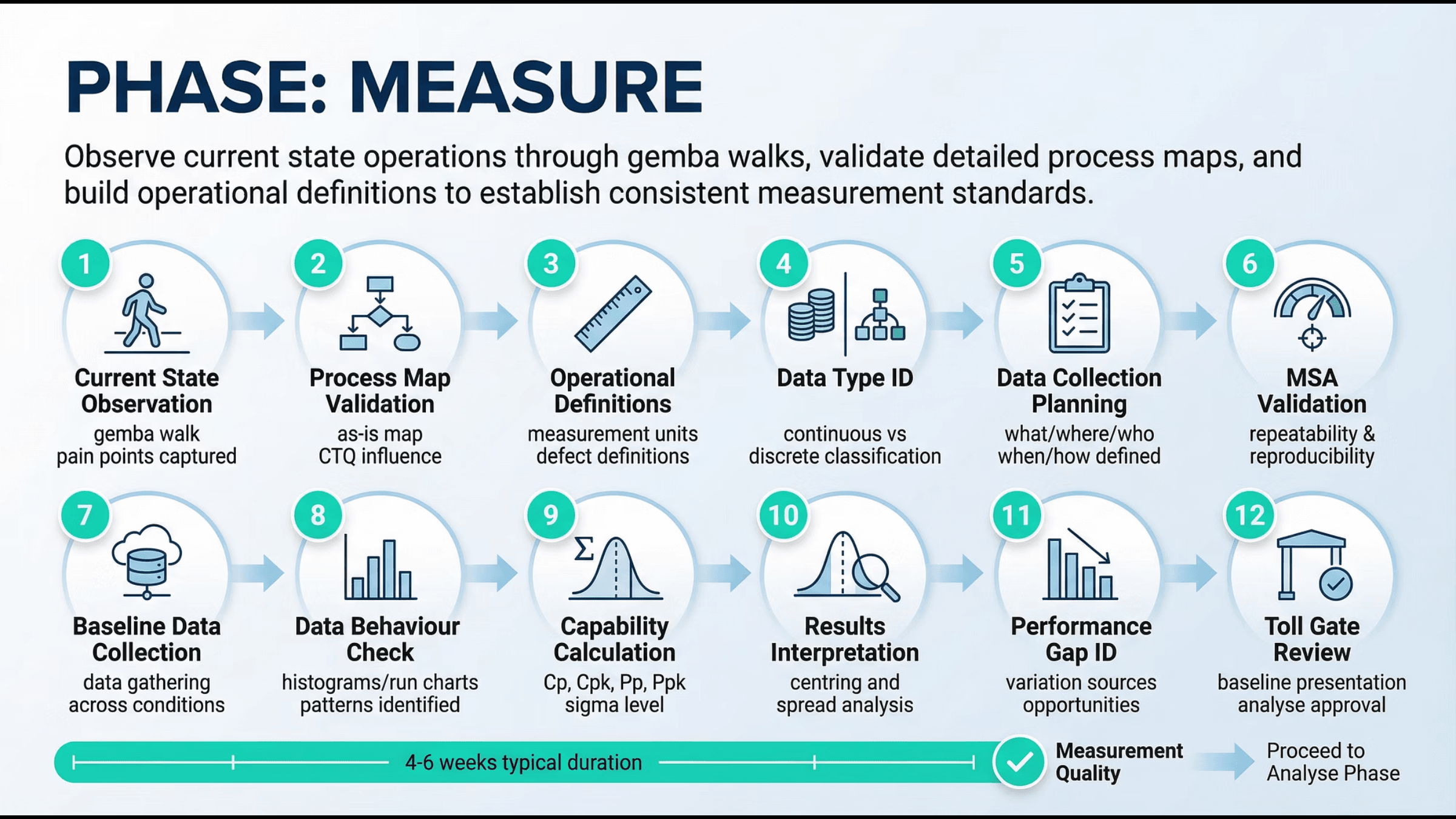 Document current state through process observation and mapping. Develop operational definitions and data collection plans. Validate measurement systems for reliability and calculate process capability metrics.