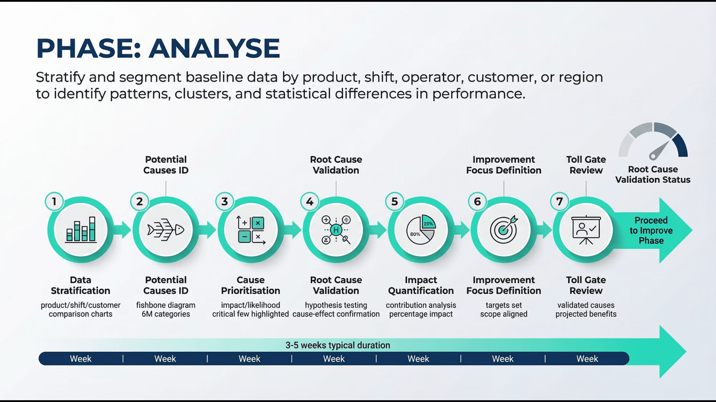 Stratify and segment data to identify patterns and trends. Generate potential causes using structured methods like fishbone diagrams. Prioritise and validate root causes through testing and data analysis.