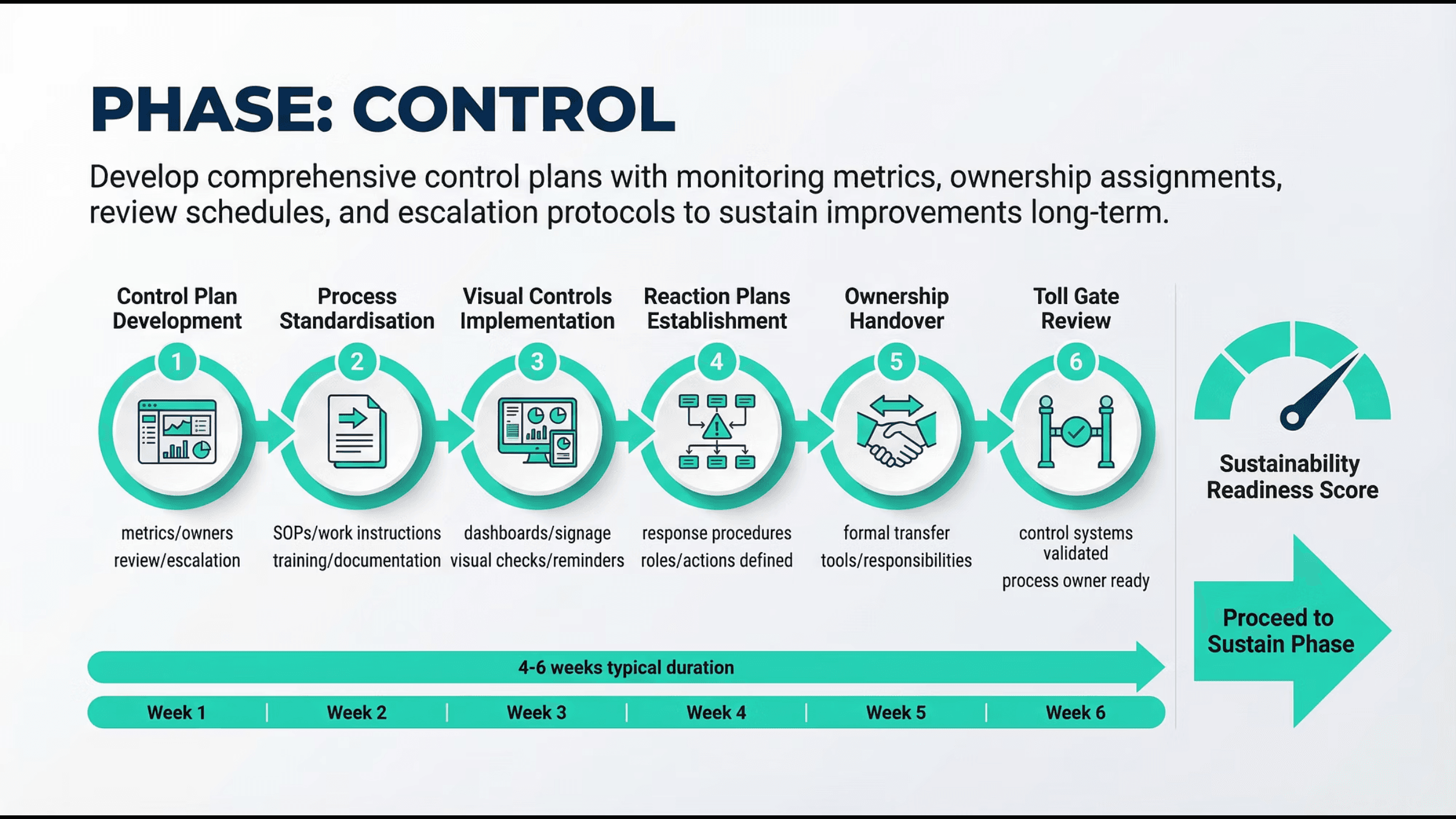 Develop comprehensive control plans with monitoring metrics and escalation triggers. Standardise improved processes through updated procedures and work instructions. Implement visual controls and reaction plans.